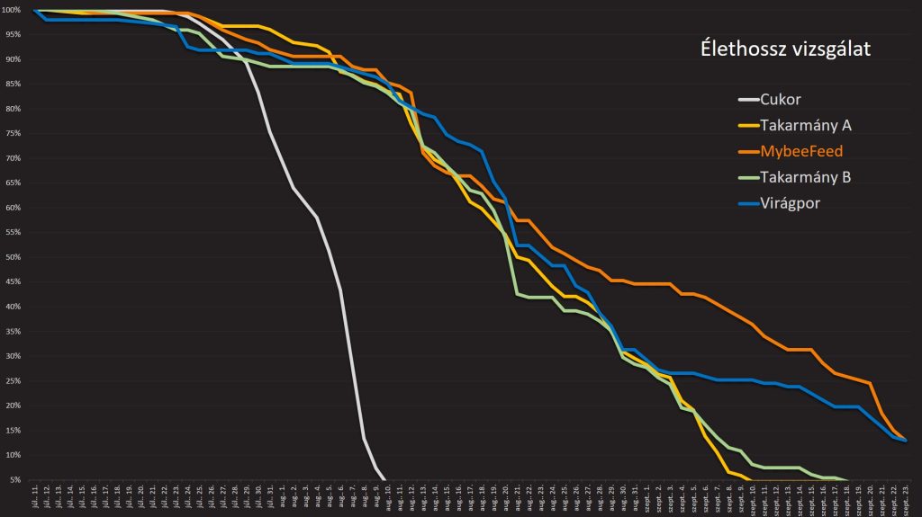 Vizsgálataink között talán az egyik legfontosabb a méhek élethosszának különböző takarmányok fogyasztása mellett történő vizsgálata volt. A hosszabb életű méhekből álló méhcsalád több fiasítást képes gondozni és nagyobb méz hozamot biztosít, mivel a méhek több generáción keresztül képesek részt venni a méhcsalád munkájában. A kísérletink során a méhcsaládok élethosszát zárt körülmények között vizsgáltuk, melyek során, ahogy az ábra is mutatja, azt láthatjuk, hogy a Mybee Feed a virágporhoz hasonlóan jelentősen meghosszabbította a méhek életét.